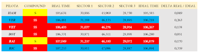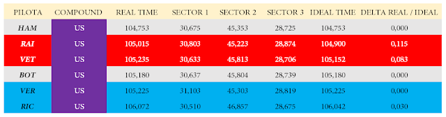 Andando ad analizzare la vera e propria simulazione di qualifica del venerdì, effettuata nel classico secondo run delle PL2, balza subito all'occhio una Ferrari molto competitiva anche sul compound UltraSoft (oltre a quello SuperSoft di cui avevamo parlato poche righe fa) con un Ideal Lap di Kimi Raikkonen a meno di due decimi dal tempo fatto segnare da Lewis Hamilton. Una Ferrari che però dovrà capire quale sia l'assetto aerodinamico più corretto tra quello utilizzato da Raikkonen e quello utilizzato da Vettel; notare come il pilota tedesco della Ferrari abbia perso quasi 5 decimi nel secondo settore da Lewis Hamilton mentre Raikkonen ben 3 decimi tra il settore 1 e il settore 3 (i più veloci del tracciato di Spa).