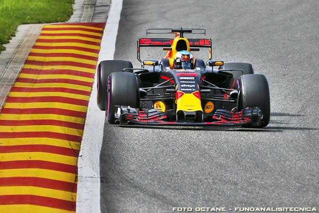 Per quanto riguarda RedBull, le prove comparative sono risultate ancora più evidenti con un assetto aerodinamico particolarmente scarico (notare quanto poco profilo alare sull'ala posteriore) portato in pista nella simulazione di qualifica da Daniel Ricciardo che non ha però dato i risultati sperati.