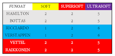 Facendo un passo indietro, RedBull aveva optato prima dell'inizio di questo weekend per una scelta notevolmente più aggressiva di Ferrari e Mercedes con ben 9 set di UltraSoft a sua disposizione e solamente l'obbligatorio di Soft. Scelta piuttosto simile anche per McLaren, con il solo Alonso a portare in pista due set di Soft, cosi da poterne provare uno nell'arco delle libere. Per quanto riguarda Ferrari e Mercedes, scelte piuttosto simili con pochi set di UltraSoft e un numero maggiore di Soft rispetto al Team concorrente RedBull.