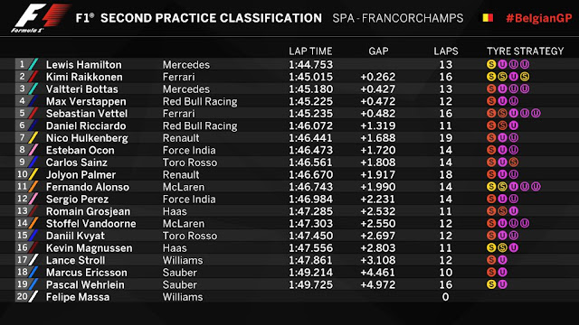 E' Lewis Hamilton il pilota più veloce in questo venerdì del dodicesimo weekend della stagione 2017 di Formula 1. In seconda posizione un molto positivo e fresco di rinnovo contrattuale Kimi Raikkonen, sempre particolarmente a suo agio sulla pista belga di Spa Francorchamps, che paga solamente 262 millesimi dal forte pilota inglese del Team Mercedes. In terza posizione un opaco Valtteri Bottas, poi Verstappen e Sebastian Vettel, lontano di quasi 5 decimi da Hamilton e di due decimi dal proprio compagno di squadra.