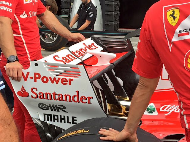 Ma passiamo all'assetto aerodinamico delle Ferrari SF70H viste alle classiche verifiche tecniche del giovedì. Partendo dall'anteriore si può notare come il Team italiano anche per il Gran Premio d'Italia abbia scelto l'ala anteriore Belgio Spec, ossia quella che presenta una piccola modifica agli endplate dove è stato eliminato il profilo orizzontale esterno che guidava l'aria insieme al piccolo deflettore curvo. Confermati i mozzi soffiati aperti, che però, cosi come in Belgio e Ungheria non potranno più chiedersi nei lunghi rettilinei per eliminare qualche punto di resistenza all'avanzamento. Questa caratteristica tecnica è stata "eliminata" da un preciso chiarimento FIA su richiesta di Mercedes.