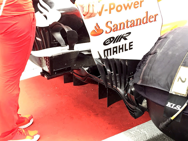 Il diffusore rimane invece quello "classico", utilizzato da Raikkonen e Vettel durante tutta questa positiva (fin qui) stagione. La versione utilizzata nei test dell'Ungheria potrebbe vedersi nuovamente in pista nel prossimo appuntamento che si correrà a Singapore tra due settimane anche se tale informazione necessita di importanti verifiche nei prossimi giorni.