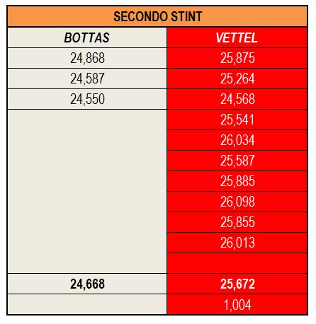 Se si analizza il run sul compound Soft, da inizio mondiale amico principalmente della Mercedes W08 e su cui il Team anglo tedesco oggi non ci ha perso molto tempo, si nota come nemmeno Vettel sia stato competitivo nella giornata odierna in simulazione di gara. Nel gap "a giro" del pilota tedesco della Ferrari è da inserire comunque un "fuel effect" di circa 2 decimi a suo favore.