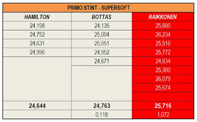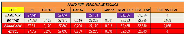 Ma passiamo ad analizzare i due run di "simulazione della qualifica" che si effettuano come di consueto il venerdì pomeriggio: possiamo notare una Mercedes molto competitiva sia sul compound Soft che su quello SuperSoft. Interessante notare come Lewis Hamilton non sia riuscito a migliorare in modo importante come Vettel e Bottas il suo crono passando dal compound Soft a quello SuperSoft. Due mescole che secondo Pirelli dovrebbero separarsi di un gap attorno ai 6-7 decimi.