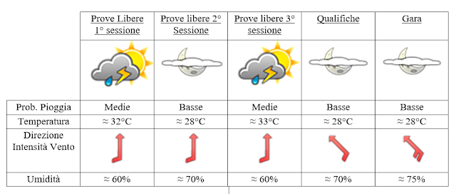 Prove libere 3° sessione, sabato ore 12:00/13:00 (ora italiana): terza sessione che sarà simile alla prima. Possibili temporali con temperature sempre di qualche grado superiore ai 30°C. Venti tra il debole e il moderato dai quadranti meridionali.