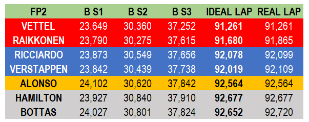 Nella seconda ora e mezza di prove libere i Team hanno svolto le classiche simulazioni di qualifica del venerdì con il compound più morbido portato in Malesia dalla Pirelli ossia la SuperSoft. Vettel superstar con Ideal Lap di 4 decimi migliore rispetto a Raikkonen, tutti presi nell'ultimo settore. La prima RedBull a 8 decimi di secondo (2 decimi nel primo e secondo settore, ben 4 nel terzo) con Mercedes a ben 1.4 secondi (3 decimi nel primo settore, 5 nel secondo e ben 7 nel terzo) che ha accusato problemi di surriscaldamento alle posteriori.