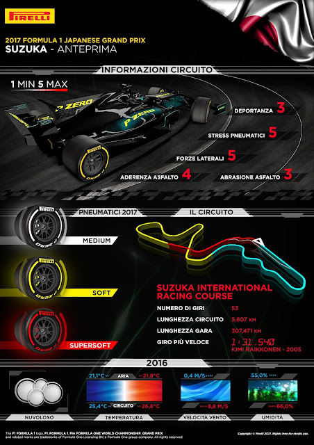 Il circuito epico di Suzuka è famoso per essere uno dei più impegnativi per i pneumatici, a causa dei carichi molto elevati che impone. Per la gara in Giappone, Pirelli ha nominato P Zero White medium, P Zero Yellow soft e P Zero Red supersoft: per la prima volta, quindi, non porterà pneumatici hard. Le tre mescole scelte dovranno far fronte a curve lunghe e veloci, con il picco della 130R – con un carico trasversale estremamente elevato, nonché fra i più prolungati del campionato – e della curva Spoon, che mette costantemente alla prova i pneumatici. Quest’anno i giri veloci in gara sono stati più veloci fino a cinque secondi rispetto al 2016 e anche a Suzuka si prevede un altro miglioramento significativo. Per questa gara si può scegliere tra diverse strategie per cercare il miglior compromesso tra prestazioni e durata.