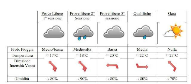 Prove libere 1° sessione – venerdì ore 3:00/4:30 (ora italiana): la prima sessione di prove libere vedrà cieli coperti, con rischio pioggia medio basso. Il peggioramento (molto intenso) previsto per la giornata di domani dovrebbe arrivare nel pomeriggio/sera (posticipato rispetto a quanto previsto nei giorni precedenti). Temperature sui 17°C e venti moderati sud-orientali.