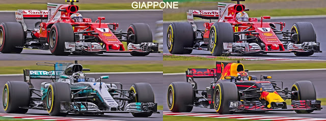 Se negli ultimi due appuntamenti, Singapore e Malesia (la pole per Vettel era alla portata), la Ferrari SF70H si era dimostrata anche nelle fasi di qualifica la miglior vettura del lotto, in Giappone non è stato cosi. In un circuito dove la potenza massima della Power Unit è tornata a giocare un ruolo importante nell'arco del singolo giro (un 10% in più rispetto alla Malesia), e dove Mercedes ha riproposto la Power Unit numero 4 utilizzata solamente a Spa e Monza (in Malesia era stata utilizzata la Power Unit numero 3), la W08 è tornata prepotentemente ad occupare (almeno teoricamente) tutta la prima fila. Ma nella giornata odierna anche il lato aerodinamico/meccanico della SF70H non è stato sicuramente all'altezza di quello della W08 se si considera che dei quasi 5 decimi di distacco, "solo" due terzi (3 decimi) sono da imputare al gap motoristico ancora presente dopo l'introduzione da parte di Mercedes (a Spa) e Ferrari (in Malesia) degli ultimi aggiornamenti alle loro unità motrici.