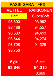Durante le prove libere 3 entrambi i piloti del Team italiano hanno effettuato invece delle simulazioni più interessanti. E i risultati sono soddisfacenti se si calcola che Kimi Raikkonen è riuscito a tenere un passo leggermente più lento di quello fatto segnare da Lewis Hamilton nella giornata di ieri (guardare la tabella in basso), pur con degli pneumatici usati nelle prove libere 1 e con già all'attivo 9 giri. Non solo ottimo ma anche importante invece il passo tenuto da Sebastian Vettel sul compound Soft, girando costantemente sotto al minuto e trentaquattro secondi per un run di sei giri.