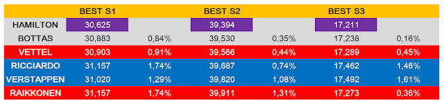 Interessante anche notare che Lewis Hamilton è il pilota che poteva migliorare maggiormente il proprio tempo "reale" fatto segnare in qualifica, aumentando il gap su Valtteri Bottas a oltre 4 decimi e su Sebastian Vettel ad oltre 5 decimi.