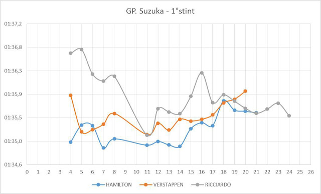 Molto positivo il fatto che la RB13 su una pista in cui conta moderatamente la potenza della Power Unit sia riuscita, almeno in gara, a mettere pressione alla W08. Una RB13, che così come la W08, è una vettura che ha un range di funzionamento delle gomme piuttosto stretto ma che almeno in questo Gran Premio del Giappone ha potuto beneficiare in modo importante dell'innalzamento delle temperatura nella giornata di gara. Con le temperature della giornata di sabato (15°C in meno rispetto alla domenica) i due piloti del Team anglo austriaco hanno fatto fatica a tirare fuori il massimo dalla vettura. Oltre al fatto che la Power Unit francese paga ancora troppa cavalleria (si parla di 35 CV nelle fasi di qualifica) rispetto alla Power Unit di riferimento, ossia Mercedes.