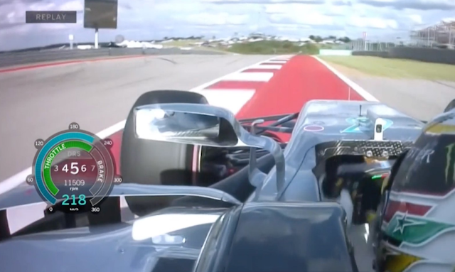 Nel sesto giro di gara, dopo due giri veloci, Hamilton è riuscito a scendere sotto al secondo di distacco nel punto della pista che permette il successivo utilizzo del DRS; solo 7 decimi separavano il pilota tedesco della Ferrari, già con problemi di blistering sull'anteriore sinistra, dal forte pilota inglese della Mercedes ad inizio del lungo rettilineo del secondo settore di Austin. E grazie ad una Power Unit in modalità Full Gas (al contrario della Ferrari di Vettel), un DRS molto efficiente (che sommati fanno 32 km/h in più) fin da inizio stagione sulla sua W08, e da un Sebastian Vettel poco attento, Hamilton è riuscito a portarsi piuttosto agevolmente in prima posizione allungando la staccata.