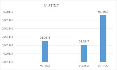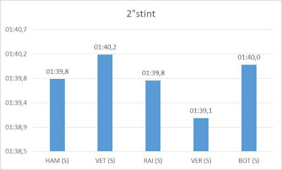 Anche analizzando i passi gara del primo stint possiamo notare che, Hamilton, è stato nettamente più veloce di tutti gli altri. Un ritmo migliore di ben 3 decimi al giro su Vettel, 4 su Raikkonen, Bottas e Verstappen. Il ritmo del pilota olandese, in linea con quello di Vettel, Bottas e Raikkonen, è stato molto buono, in quanto, impegnato in una furiosa rimonta dal fondo dello schiarimento a causa della sostituzione della Power Unit. Verstappen, partito con le gomme Super Soft, è riuscito a girare con molta costanza e velocità portandosi, alla fine del suo stint, a ridosso dei primi cinque piloti in classifica.