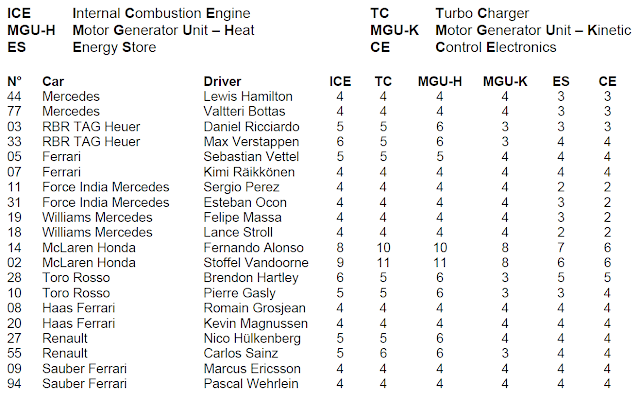 Per quanto riguarda Alonso non ci sono invece delle buone notizie: la Power Unit Honda utilizzata ad Austin si è danneggiata dopo i nuovi problemi incorsi al motogeneratore MGU-H (uno dei grandissimi problemi di Honda in questo 2017) e per questo sarà necessaria una sostituzione dell'unità motrice con almeno 20 posizioni di penalità (sembrerebbe che non verranno sostituite parco batterie, centraline e MGU-K). Penalità addirittura maggiori per Stoffel Vandoorne, che installando sulla propria MCL32 una unità motrice completamente nuova, dovrà scontare ben 35 posizioni di penalità. Una piccolissima nota (forse) positiva è quella che su entrambe le vettura verrà montata l'ultima evoluzione della power Unit Honda, la 3.8, che garantisce qualche (pochissimi) CV in più e, secondo Honda, una miglior affidabilità. Un qualcosa però non confermato ad Austin visto che tale specifica sulla MCL32 di Vandoorne ha percorso solamente 250 km circa.