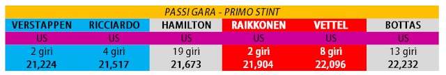 Analizzando i passi gara, molto positivi Lewis Hamilton e la sua W08 nella simulazione spaventosa del primo stint di gara su UltraSoft: 25 giri di run (saranno 71 i giri da percorrere in gara) di cui 19 buoni per la media dello stint con un passo sul 21 medio. Si confermano molto performanti anche le due RedBull che però non sono riuscite a concentrarsi sull'usura della mescola più morbida per via di problemi alle unità motrici Renault (soprattutto Verstappen). Per quanto riguarda Ferrari, entrambe le SF70H hanno faticato sulle UltraSoft a serbatoi pieni. Un discorso che vale anche per Valtteri Bottas, positivo nella prima ora e mezza di libere ma "sprofondato" nella seconda dove Lewis Hamilton è tornato invece a far la differenza anche grazie a importanti modifiche di setup dove delle PL1 piuttosto negative.