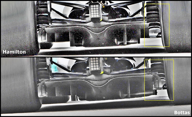Inutile girarci troppo attorno, la gara si è decisa in partenza quando Verstappen è riuscito, grazie ad una manovra tanto precisa quanto spettacolare, a sorprendere e sopravanzare Sebastian Vettel. Il pilota tedesco della Ferrari ha provato a difendersi lasciando poco spazio all'arrembante pilota olandese ma senza successo. Da questa bagarre ne stava approfittando un attento e intelligente Lewis Hamilton che, molto astutamente, aveva sopravanzato in curva 3 Sebastian Vettel. Ma in uscita di curva il pilota tedesco della Ferrari, per una traiettoria troppo interna, ha perso il posteriore della sua SF70H (sovrasterzo di potenza) andando a colpire con l'ala anteriore la posteriore destra della W08 di Hamilton. Conseguenze? La foratura per il quattro volte campione del mondo Mercedes. Una manovra che, in una situazione "normale" di gara (sicuramente non nella gara che avrebbe portato Hamilton all'iride), poteva costare una penalità a Vettel ma che non è stata punita dai commissari sportivi. I primi due della classifica iridata sono stati costretti a rientrare ai box per la sostituzione del musetto per Vettel e per la sostituzione degli pneumatici per il pilota inglese della Mercedes. Un Lewis Hamilton che, oltre ad aver perso ben 14 secondi nel lento giro di rientro, ha subito un importante danneggiamento della zona esterna del diffusore. Come potete osservare nell'immagine in basso, sulla vettura n°44 di Hamilton sono stati completamente danneggiati i profili ad arco che hanno la funzione di ripulire le turbolenze generate dalla rotazione delle gomme. Un'importante danno da 0.35 secondi al giro, la bellezza di ben 25 secondi nell'arco dell'intera gara che sommati ai 14 secondi di rallentamento nel giro di rientro fanno 39 secondi.