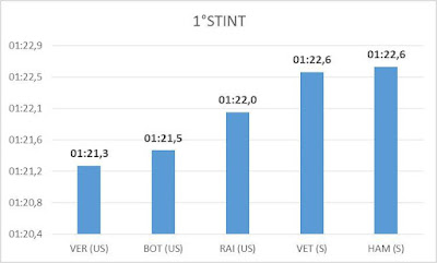 Se ci concentriamo nell'analizzare i singoli stint ci possiamo rendere conto che Verstappen ha chiaramente dominato la corsa. Nel primo stint è stato più veloce di Bottas di 2 decimi e di Raikkonen di ben 7 a parità di compound. Vettel ed Hamilton costretti a rimontare dal fondo hanno scelto di montare gomme soft con un ritmo di ben 1,3 secondi più lento rispetto al giovane pilota olandese.