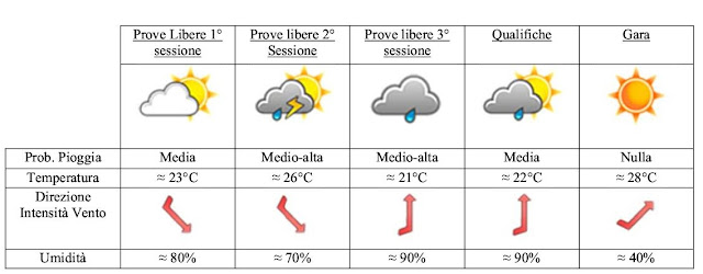 Gara, domenica ore 17:00 (ora italiana): la gara è la sessione più facile da prevedere, con cieli che risulteranno sereni e temperature in sensibile aumento, con valori che non saranno lontani dai 30°C. Venti deboli sud-occidentali.