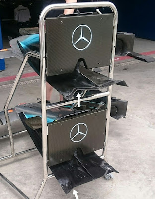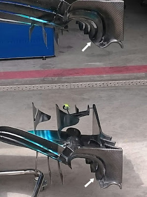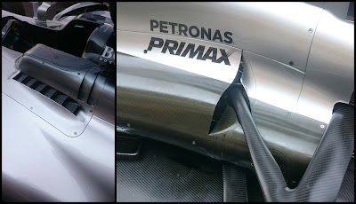 Mercedes, in Brasile, si è presentata con la stessa vettura che abbiamo visto nei recenti appuntamenti di Malesia, Suzuka, Austin e Messico. E' interessante notare, grazie alle immagini di Albert Fabrega, che, le modifiche apportate sulle "zanne" (sono dei veri e propri convogliatori di flusso utili ad incanalare nella parte inferiore della vettura un flusso d'aria molto maggiore) non interessano solo la parte anteriore ma anche quella posteriore collocata in una zona piuttosto nascosta della vettura. Come potete osservare dall'immagine in basso, è possibile notare che la parte terminale del convogliatore di flusso presenta una forma diversa per cercare di migliorare il flusso d'aria diretto verso il posteriore della vettura.