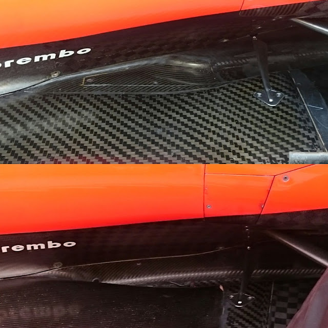 La prima novità, montata sulla vettura di Sebastian Vettel, è situata nella parte iniziale del tunnel centrale del fondo piatto che ha ora una nuova conformazione come si può ben vedere dall'immagine confronto qui in basso.