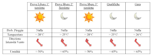 Prove libere 1° sessione, venerdì ore 10:00/11:30 (ora italiana):sessioni praticamente tutte simili dal punto di vista meteorologico. Uniche variazioni saranno quelle relative al vento. Prima sessione soleggiata, con temperatura intorno ai 28°C. Venti deboli nord-occidentali.
