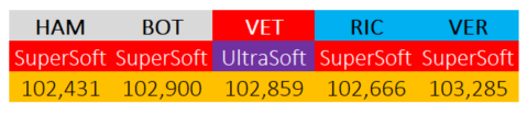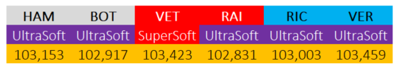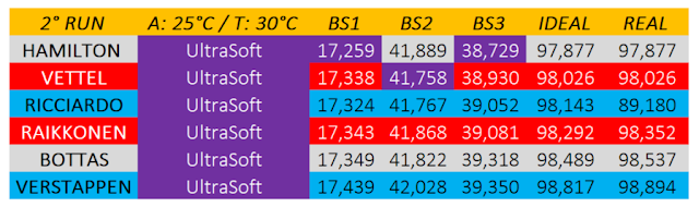 Nella simulazione di qualifica più veritiera ossia quella con il compound UltraSoft (temperatura della pista attorno ai 30°C, delta con il compound SuperSoft di circa 8 decimi di secondo) è successo quanto ci si poteva aspettare ossia Ferrari a guadagnare più di tutti con Mercedes comunque competitiva.