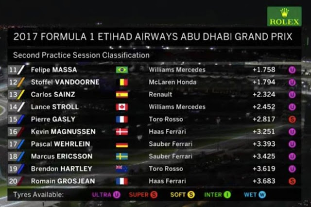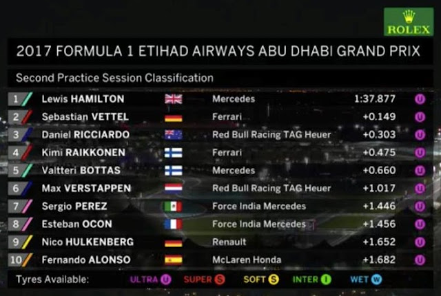 Nella seconde e "fresche" (si sono disputate alle 17 ora locale) prove libere del Gran Premio di Abu Dhabi a brillare è stato un convincente Lewis Hamilton. Alle sue spalle, molto più vicino di quanto siamo solitamente abituati a vederlo nei venerdì di gara, possiamo trovare il vice campione del mondo 2017 ossia Sebastian Vettel.
