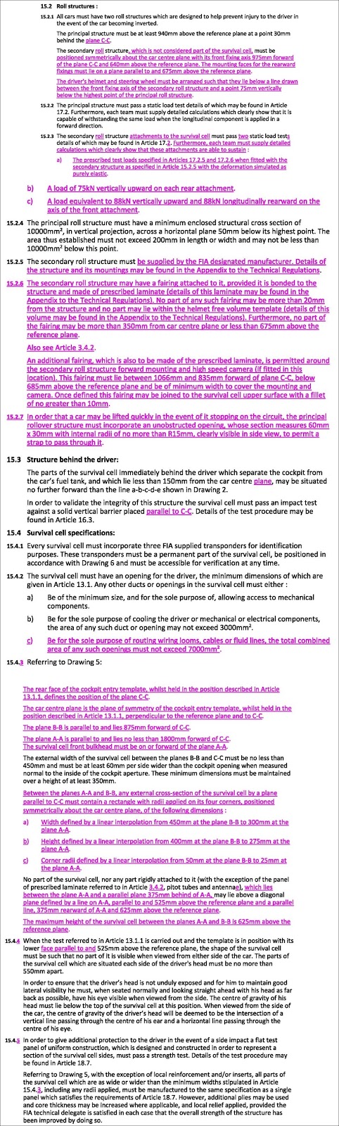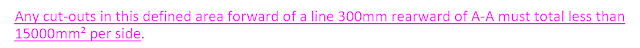 Più precisamente, a quanto capito, la Federazione Internazionale non ha voluto intervenire direttamente sulla sezione A-A ma è andata a limitare direttamente l'area che potrà essere "coperta" dal vanity panel con ovvie conseguenze quindi anche sulle possibilità di svasare eccessivamente la parte anteriore del telaio; nella prossima stagione l'apertura dei pozzetti nella parte anteriore della scocca non potrà superare i 15000 mm2 contro i 22500 mm2 permessi nel 2017. Che cosa significa? Il vanity panel continuerà ovviamente ad essere utilizzato ma assumerà sempre meno una funzione "strutturale", ritornando a ricoprire la funzione di cover per evitare gli antiestetici scalini che si erano visti a partire dalla stagione 2012.