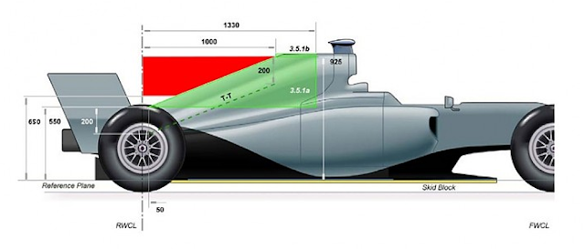 Come si legge dal nuovo regolamento, dunque, l'articolo 3.5.1 punto a) limita le dimensioni del cofano motore, intatto rispetto alla versione di regolamento tecnico 2017, imponendo, o meglio aggiungendo, tramite l'articolo 3.5.1 punto c) l'assenza di carrozzeria al di sopra dei 650 mm dal piano di riferimento in un'area delimitata da una linea verticale situata a 1000 mm dall'asse posteriore (RWCL) e dall'asse posteriore stesso.