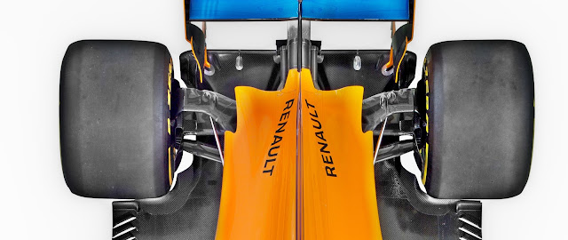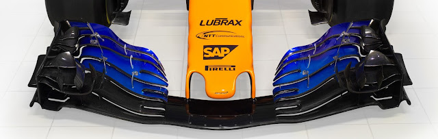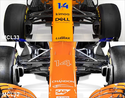 Ritornando all'analisi tecnica di questa vettura possiamo notare che, Tim Goss e Peter Prodromou non hanno apportato grossi stravolgimenti cercando di andare a sviluppare i concetti aerodinamici e meccanici della MCL32. L'ala anteriore è rimasta pressoché similare alla vettura 2017. E' stato mantenuto il tunnel e il concetto aerodinamico generale con la parte esterna che espelle l'aria ai lati e al di sopra degli pneumatici anteriori. Promossi anche i flap supplementari dell'ala anteriore che sono molto accurati nella zona più interna per cercare di controllare nel miglior modo possibile il vortice Y250. Gli aerodinamici, grazie alla soluzione tecnica adottata, vogliono depotenziare il vortice Y250 e allontanarlo il più possibile dalla vettura grazie ai vortici generati dai turning vanes. E' fondamentale allontanare questo vortice per evitare problemi aerodinamici nella zona centrale e posteriore della monoposto.