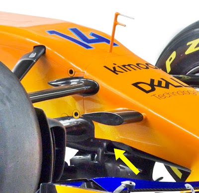 Anche nella zona dei bargeboard e dei deviatori di flusso laterali alle pance non si possono notare importanti sviluppi. La maggior parte dei macrocomponenti sono gli stessi che abbiamo visto montati sulla MCL32 nella passata stagione con piccole novità sui bargeboard inferiori.