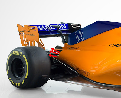 Confermata il supporto a singolo pilone dell’ala posteriore e gli endplate dell’ala posteriore che sono stati pensati su due livelli con la parte alta che presenta una sezione più esterna ma che mantiene delle “frange” che scendono verso il basso coprendo quello che è un vero e proprio foro che permette all'aria di entrare al di sotto dell'alettone posteriore. Una soluzione utile ad aumentare la generazione di carico aerodinamico tramite l'ala posteriore.