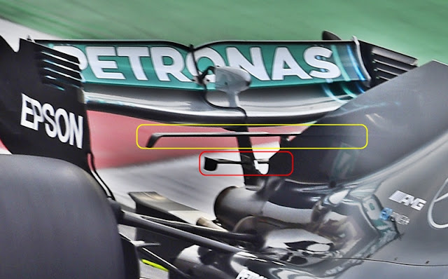 Come si può ben vedere dalla prima immagine nell'articolo è stato confermato il profilo alare nel box rosso che avevamo già visto nel filming day effettuato dal Team anglo tedesco lo scorso giovedì a Silverstone. Questa ala non è posizionata nella porzione di vettura permessa dall'articolo 3.5.1 (e quindi relativo alle T Wing) ma bensì nella zona dove può essere installato il monkey seat in versione 2018. Per la stagione 2018 la FIA ha voluto limitare enormemente l'utilizzo dei più classici monkey seat che eravamo abituati a vedere nelle passate stagioni, aggiungendo un articolo che vieta l'aggiunta di carrozzeria nella zona posteriore ai 200 mm dall'asse delle ruote posteriori, ad una altezza tra i 400 mm e i 550 mm dal piano di riferimento dell'auto (vedere il disegno appena in alto). Nella parte anteriore ai 200 mm dall'asse posteriore sono ancora installabili profili aerodinamici, trasversalmente larghi al massimo 200 mm (100 mm a destra e sinistra dall'asse longitudinale della vettura) e questo è ciò che ha fatto e sta facendo Mercedes.