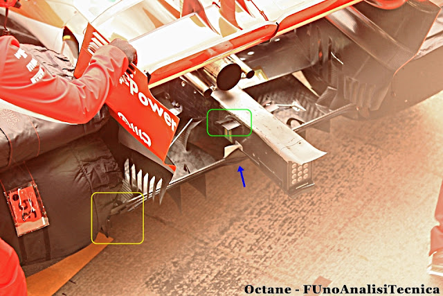 La Ferrari ha utilizzato nelle ultime stagioni delle soluzioni molto efficaci ma poco efficienti dal punto di vista aerodinamico grazie all'utilizzo di molti generatori di vortici (i vortici, aerodinamicamente parlando, generano fenomeni dissipativi che incrementano la resistenza all'avanzamento) come si può ben vedere dall'immagine appena in alto. La soluzione portata in pista invece da Redbull, e ripresa dal team italiano nell'ultimo weekend della scorsa stagione, è un qualcosa sicuramente di più semplice e più efficiente grazie a "sole" due soffiature create grazie all'utilizzo di gurney flap che corrono lunga tutta la lunghezza del diffusore.