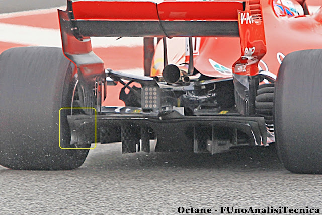 E non solo è stata modificata la parte esterna del diffusore, se confrontato alla specifica 2017, ma, come si può vedere dalla prima immagine dell'articolo, anche la parte centrale include delle novità. La Ferrari ha ripreso una modifica che aveva portato in pista nei test post Gran Premio d'Ungheria con l'introduzione di un diffusore con la parte centrale del diffusore rettilinea che è utile, se progettato coerentemente al flusso in arrivo sul posteriore delle vettura, a generare maggior carico grazie ad un angolo di espansione maggiore.