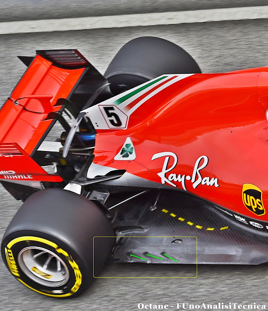 Sempre focalizzandoci sulla zona del fondo davanti alle ruote posteriori, si può notare, grazie ad una foto FUnoAnalisiTecnica, l'allungamento del profilo a ricciolo (in verde nella seconda fotografia) stile Mercedes che il Team italiano aveva introdotto sulla SF70H nel Gran Premio del Belgio.