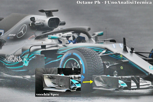 Come potete osservare dal confronto in alto la zona della deriva verticale dell'ala anteriore è stata modificata. Non ci sono più le tre soffiature nella parte terminale ma è stato collocato un profilo di forma arcuata e le soffiature sono diventate solo due. Mercedes con questa modifica è riuscita a inglobare la funzione del deviatore di flusso interno agli endplate e posizionato sopra al tunnel, dietro gli upper flap, con i deviatori veri e propri degli endplate (vedere la foto successiva). Confermato, invece, il piccolo profilo aerodinamico ancorato agli endplate.