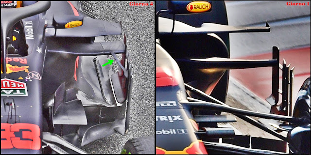 Ma il Team anglo austriaco è corso subito ai ripari: nella notte è arrivata dall'Inghilterra una nuova specifica di deviatori che non presenta novità dal punto di vista aerodinamico ma bensì un rinforzo che dovrebbe limitare le vibrazioni e quindi le micro rotture.Adrian Newey ha lavorato molto sulla flessione della parte centrale della RB14 tanto che alcuni Team stanno dando uno sguardo molto attento alla flessione dell'ala posizionata al di sopra delle pance, che, alle alte velocità, fletterebbe in modo importante.