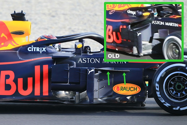 Questa mattina, sulla vettura di Max Verstappen, si è notata una modifica nella zona dei bargboards con l'aggiunta di una pinna (stile Williams) che va a raccordarsi direttamente con i deviatori di flusso collocati nella zona esterna delle fiancate. Modifica pensata dagli aerodinamici per cercare di "spingere" il flusso d'aria verso il basso e diretto verso il posteriore della monoposto.