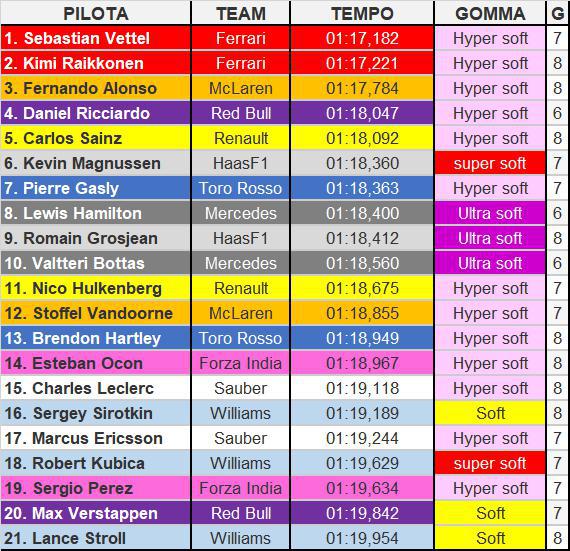 Se confrontiamo i tempi del pilota belga della Mclaren con quelli di Renault e Toro Rosso possiamo notare che la McLaren, a livello prestazionale, sembra essere al livello della RS18 e sicuramente migliore rispetto alla STR13. Positivo per Alonso, Vandoorne e più in generale per gli ingegneri del Team inglese il degrado gomme: sia con le mescole più morbide che con quelle più dure il tutto sembra essere piuttosto sotto controllo e, dai dati analizzati, non sembra rappresentare un grosso problema per il team di Woking. Purtroppo sembra mancare ancora parecchio a livello prestazionale per lottare con i 3 top Team. Analizzando le simulazioni, la RedBull è lontana 1 secondo al giro mentre rispetto a Ferrari e Mercedes il gap è ancora più elevato.