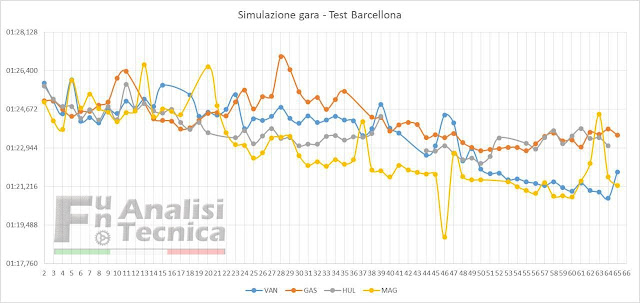 Se si guarda la simulazione di gara di Hulkenberg ci sono segnali leggermente più negativi: il passo del pilota tedesco è stato molto simile a quello di Vandoorne effettuando però una sosta in più rispetto al pilota belga della McLaren.