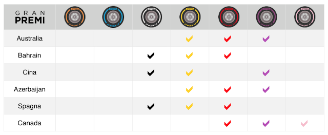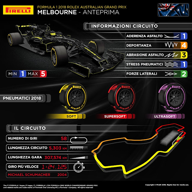 Al contrario della passata stagione i vari Team non hanno effettuato la scelta dei vari compound da portare per questo primo evento della stagione 2018 di Formula 1 al" buio". Pirelli ha infatti portato le mescole che vedremo nei 21 appuntamenti nei test post Gran Premio di Abu Dhabi. Le scelte sono interessanti: Mercedes più aggressiva di Ferrari è già di per sé una notizia; come se il Team anglo tedesco, al momento della scelta, quindi oltre tre mesi fa, non fosse cosi sicuro di avere risolto pienamente i problemi sui compound più morbidi e volesse "testarli" maggiormente nel weekend di gara. Hamilton si occuperà di testare la "rossa" sui long run, Bottas la "gialla", invece entrambi la gomma da qualifica "viola". Scelta di "mezzo" per RedBull con 8 treni di UltraSoft, 3 di SuperSoft e 2 di Soft. McLaren si conferma anche in questo inizio di stagione come uno dei team più aggressivi nella scelta degli pneumatici, come se la MCL33 derivasse dalla gentile vettura dello scorso anno.