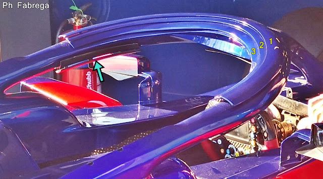 Oltre a questo, si può notare come i tecnici coordinati dal Franz Tost abbiano inserito due profili anche nella parte interna / inferiore dell'anello (freccia azzurra nella prima immagine).