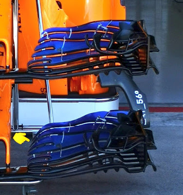 Andando ad analizzare le immagini che provengono dai box australiani possiamo notare che il team di Woking ha portato in pista due versioni di ala anteriore. Come potete osservare dall'immagine in basso la differenza principale sta nella forma dei flap supplementari che sono fondamentali per gestire nel migliore dei modi il nocivo vortice chiamato Y250.
