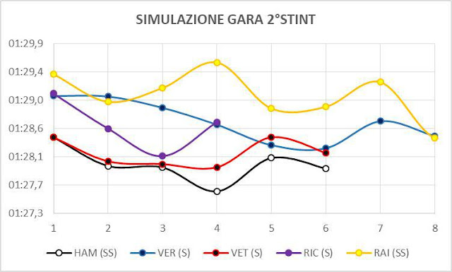 Se analizziamo i tempi medi, possiamo notare che, il passo dei primi 6 è molto similare ad eccezione di quello di Ricciardo che è riuscito a "viaggiare" su un ritmo sorprendente anche se, lo stint del pilota australiano, è stato di soli 7 giri e su una mescola cosi morbida come la UltraSoft la lunghezza dello stint può sicuramente fare la differenza. Hamilton, come potete osservare dal grafico in alto, è il pilota che ha iniziato il proprio stint più lentamente per cercare di non stressare termicamente le proprie gomme, per poi abbassare i suoi crono fino a girare qualche decimo meglio dei suoi rivali.