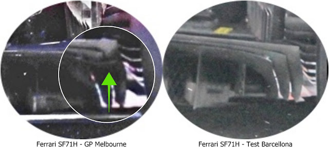 La Ferrari ha utilizzato nelle ultime stagioni delle soluzioni molto efficaci ma poco efficienti dal punto di vista aerodinamico grazie all'utilizzo di molti generatori di vortici (i vortici, aerodinamicamente parlando, generano fenomeni dissipativi che incrementano la resistenza all'avanzamento) come si può ben vedere dall'immagine appena in alto.La soluzione portata in pista invece da Redbull, e ripresa dal team italiano nell'ultimo weekend della scorsa stagione, è un qualcosa sicuramente di più semplice e più efficiente grazie a "sole" due soffiature create grazie all'utilizzo di gurney flap che corrono lunga tutta la lunghezza del diffusore. La soluzione ripresa dalla RedBull RB13 è stata mantenuta anche sulla SF71H 2018 e tra i secondi test pre stagionali e il primo weekend della stagione è stata evoluta grazie all'aggiunta di un piccolo profilo trasversale che dalla parte interna del diffusore va a congiungersi a quella esterna.