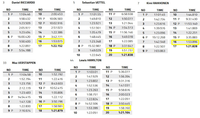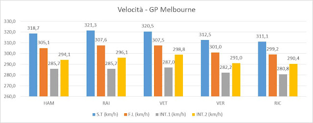 Analizzando i tempi non sorprende vedere un Hamilton molto veloce ma è più curioso trovare un Verstappen che è stato più veloce delle due Ferrari (come Ideal Lap vero e proprio). La RB14 paga ancora diversi cavalli di potenza rispetto a Mercedes e Ferrari e nonostante questo, i due alfieri di Milton Keynes, sono piuttosto vicini ai tempi realizzati dalla vettura di Maranello. La RB14 aveva già dimostrato a Barcellona di essere un'ottima vettura e lo ha dimostrato anche qui in Australia. La velocità nelle curve, dati GPS, è molto simile e in alcune curve anche superiore alla Mercedes ma purtroppo deve fare i conti con l'handicap della potenza che si fa sentire specialmente in qualifica visto che, il motore francese, non dispone di una mappatura cosi "aggressiva" come Mercedes e Ferrari. Quanto scritto sopra lo si evince anche analizzando il settore 3 dove è importantissimo il carico aerodinamico e la trazione. In questa sezione di pista Verstappen è piuttosto vicino ad Hamilton nonostante un errore commesso dal pilota olandese che gli è costato circa 2 decimi di secondo. Senza l'errore del pilota olandese ci saremmo trovati con la prima RedBull a 4-5 decimi dal quattro volte campione del mondo.