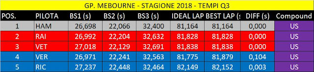 Le qualifiche del Gran Premio di Melbourne ci hanno regalato la pole position numero 73 di Lewis Hamilton che, grazie ad un giro perfetto, ha preceduto le Ferrari di Raikkonen e Vettel e le due Red Bull di Verstappen e Ricciardo. Non pervenuto invece Bottas che all'inizio del Q3 ha sbattuto sul muretto esterno della prima chicane danneggiando in modo piuttosto serio la sua W09. Il pilota finlandese scatterà dalla posizione numero 15 a causa della sostituzione del cambio.