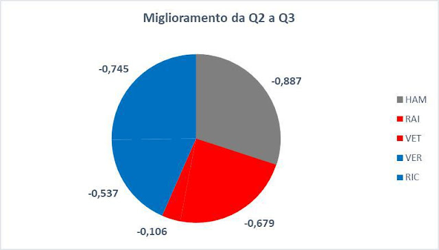 Il giro da "woow" di Lewis Hamilton fatto nell'ultimo stint del Q3 non è da associare esclusivamente alla mappatura da qualifica di cui dispone Mercedes ma anche alla bravura del quattro volte campione del mondo che ha trovato il giro perfetto, con tre fucsia nel momento giusto, senza commettere errori. Analizziamo i dati, Hamilton, rispetto al Q3 è il pilota che ha migliorato maggiormente il proprio tempo: precisamente di 887 millesimi. E se andiamo a vedere i delta time di Verstappen e Raikkonen, il pilota olandese si è migliorato di oltre 7 decimi mentre il finlandese di oltre 6 decimi e mezzo.